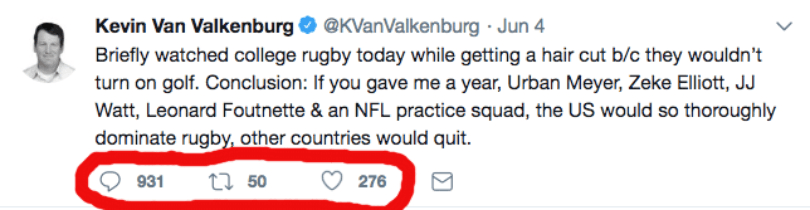 He may have been ambitious in his timeline, but ESPN writer Kevin Van Valkerburg was right on the money when he tweeted earlier this week that football players would dominate if they played rugby. Naturally, he got hundreds of angry responses from rugby fans all over the world and successfully found the true national psyche of New Zealand: insecurity.