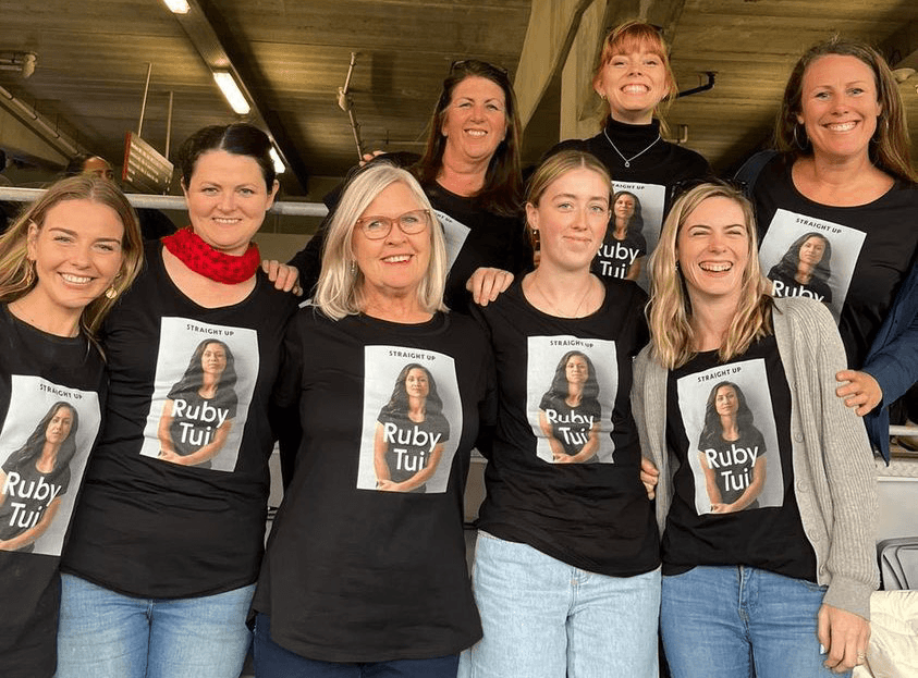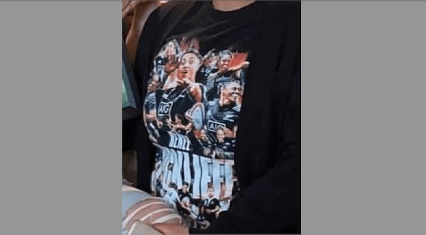 I was unable to contact Wickliffe’s family to use the original image so instead you get this terribly cropped, zoomed in image of a terrific player tee. Wickliffe is a Black Ferns veteran and, while she hasn’t played much this World Cup, you’ll certainly be seeing her face around the Eden Park concourse tonight.