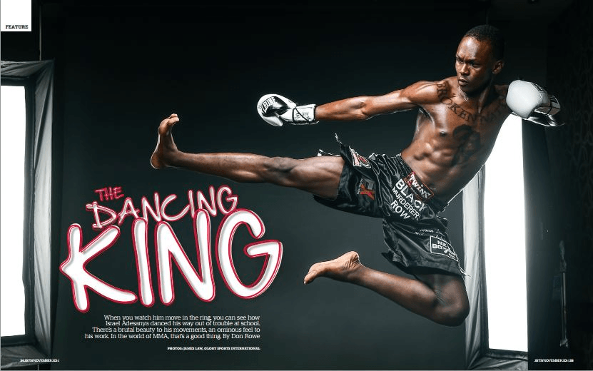 I have never met Israel Adesanya, not even in a Hamilton toilet. I do remember the image chosen for Don Rowe’s November 2014 cover story on him though. Adesanya is flying out of the shadows, his ripped body lit to emphasise every muscle, his left arm and leg perfectly parallel, his right arm cocked to strike. He is flying out of the shadows, off the page, away from the forces of gravity. His shorts are emblazoned with the words “Black Murderers Row” (Who needs apostrophes in combat situations?) and every inch of him looks lethal. And then you see his face. It is devoid of emotion. It is stone cold focus.
