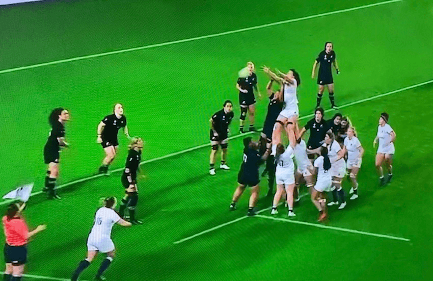 In this frame, the Black Ferns had conceded four tries from lineout drives. And in the 80th minute, being five metres out from a your own tryline with an England lineout on the way is about the last thing anyone wanted. In this frame, New Zealand had resorted to not even contesting the lineouts in favour of preparing for the maul.