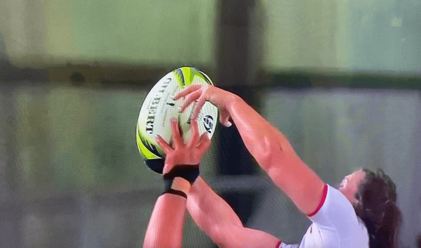 Look at this. That is as high as Ngan-Woo was lifted. Look at the England player. Now look at the ball. There is nothing in this frame that suggests any outcome other than a clean England lineout followed by a clean maul followed by a clean try followed by England as champions. Except for The Hand.