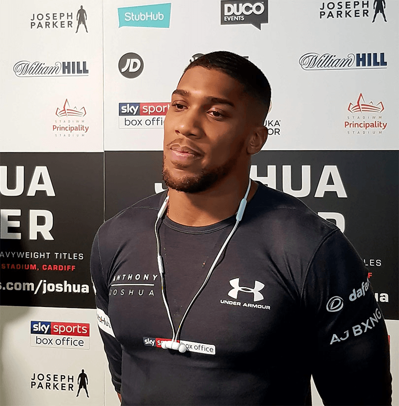 The fighting pride of the United Kingdom and the biggest name in boxing, 6’4″ Anthony Joshua cut an imposing figure as he took the stage to a roar of applause. Dressed all in black, his astonishing physique gave the impression of a stocking full of pool balls – a stark contrast to Parker, in a check suit with spectacles and a pocket square.