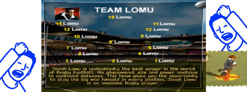 Part of Jonah Lomu Rugby’s charm was its licensing workarounds – the game’s main stadiums were Ballydown Park (Ballymore) and Tallyfield (Twickenham). It also included a host of lesser rugby nations like Hong Kong, Germany and Thailand, whose first five Laksanasongpong became something of a cult hero among the game’s fans. But Lomu was of course the game’s most potent weapon, with the ultimate challenge being to take on an entire team made up of 15 clones of the legendary winger.