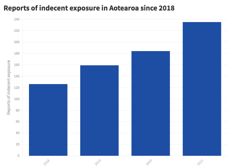 It’s also a crime that is on the rise. In information released to The Spinoff under the Official Information Act, NZ Police revealed that reported incidents of indecent exposure have increased in Aotearoa by more than 85% over the last four years. In 2018, the total number of reported incidents was 126, an average of 10.5 a month. By 2021, that number had ballooned to 235, an average of 19.5 a month. Data for 2022 revealed that 104 instances had already been reported by the end of June, averaging 20.4 a month.