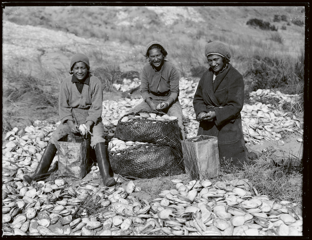 For Māori, toheroa have always been highly significant. To make the most of the huge abundance of food they provided, communities would set up temporary camps near the coast to collect and preserve toheroa for future use. The shellfish were dug out by hand and placed in woven kete that allowed the sand and water to drain out. Once gathered, toheroa could be cracked open and eaten raw on the beach, cooked in a hāngī or preserved by threading them with strings of flax and leaving them in the sun to dry.