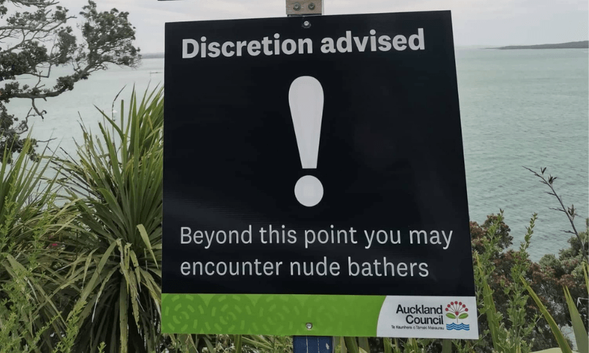 Ladies Bay is a small, hidden beach near St Heliers, with a steep walkway from the road to the water. On the way down, a number of Auckland Council plaques declared “CAUTION: past this point you may encounter nude bathers”. It didn’t help much with the nerves as we picked our way toward the sand.