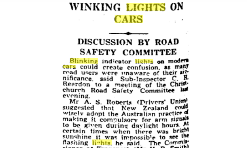 Frustratingly, I couldn’t seem to figure out when hazard lights were introduced in New Zealand. Flashing indicator lights only became widespread in the 50s, when they attracted a lot of controversy from champions of ye olde arm signals. But from anecdotal evidence from long-time road users and the internet, the hazard flash notably became a “thing” worldwide in the 80s, and that answer was as good as any.