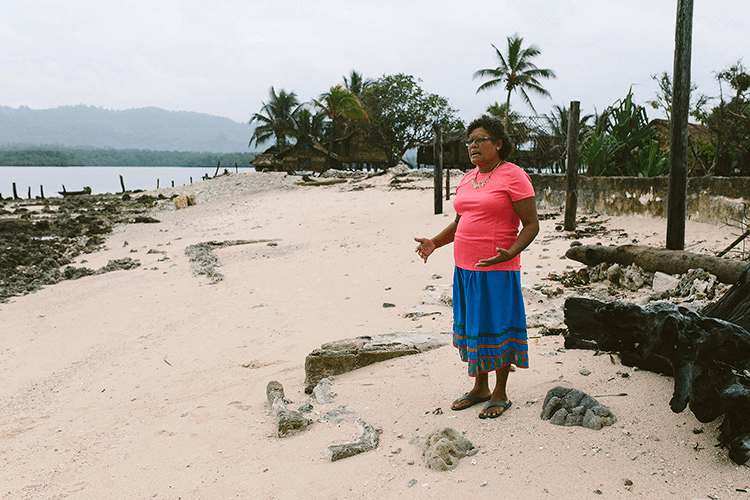 Ethel, or Aunt Ethel as she’s known to most on the island, is the unofficial leader of the Fanalei community. Aunt Ethel grew up up in Fanalei but now resides in the capital Honiara; she travels home for every holiday to bring knowledge and resources back to her family. Ethel is quick to share a story with the children in the village about what their island used to be like and what they can do to help preserve it. She showed us where the church used to stand, the centrepiece of the village. What’s left is now are a few slabs of concrete protruding from the sand. She’s not about to let her home be destroyed despite conditions worsening every year.