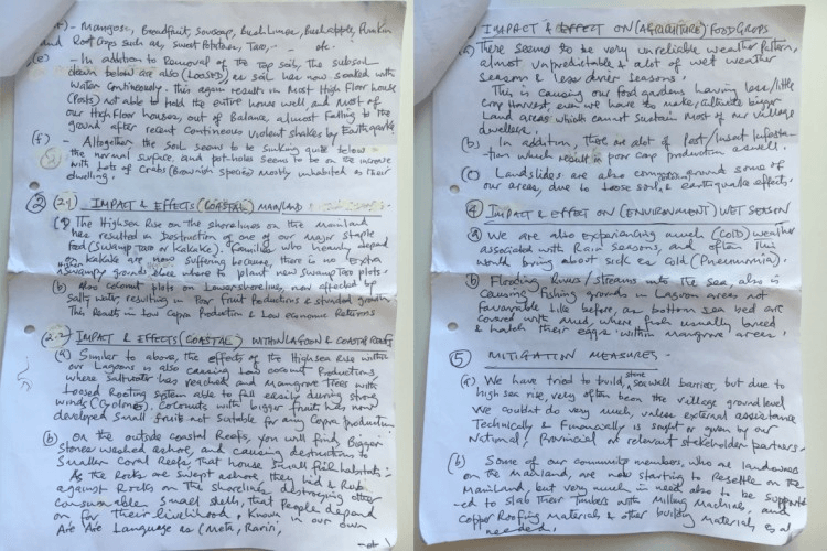 For those living in West ‘Are’are, climate change is a term they’ve come to know and understand. Through sporadic radio play and messages from the city, they’ve learned what climate change is, what’s causing it, and what it means for them. In fact, when we arrived, we were greeted by an organised assembly of speakers to discuss how their island had been hurt by climate change, and given a meticulously handwritten document outlining, in great detail, what needs to be done for them to resettle and retain their livelihoods through land and crops.
