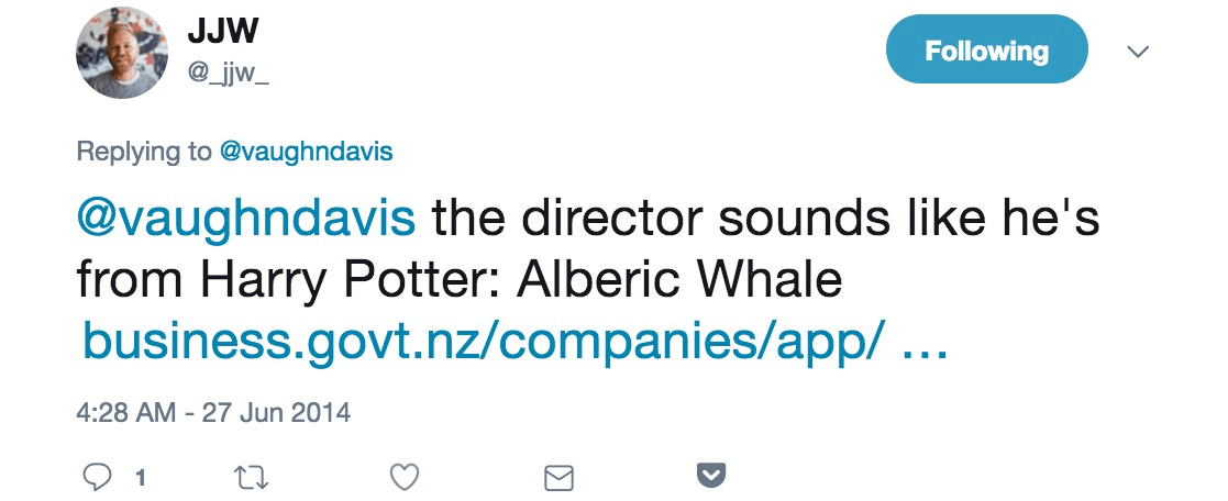 The tweet in question was part of a conversation about The Terrible Foundation, a charity founded by Albi Whale. Someone mentioned Alberic Whale didn’t have much of a digital footprint. “There’s a story in that I reckon,” tweeted Vaughn Davis.