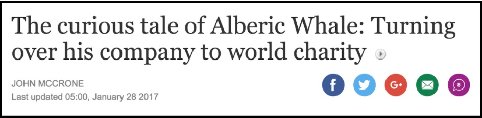 That was four years ago. And it appears there was a story in it: “The curious tale of Alberic Whale: Turning over his company to world charity” appeared on Stuff business in January 2017. The feature – all 3000 plus words of it – adopted a somewhat sceptical tone, but John McCrone largely let the boasts made by 25 year old Whale go unchallenged.