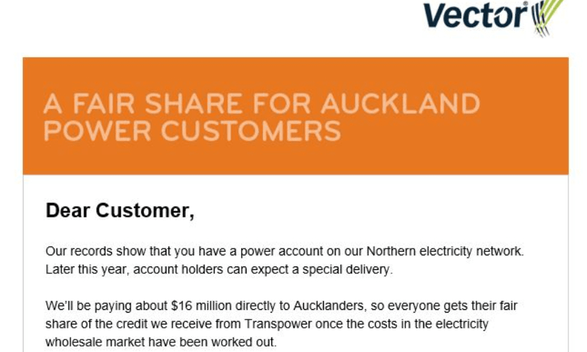 A month or so ago, if you live in Auckland and you’re the person who pays the power bill, chances are you received an email from Auckland electricity provider Vector, which looked like this:
