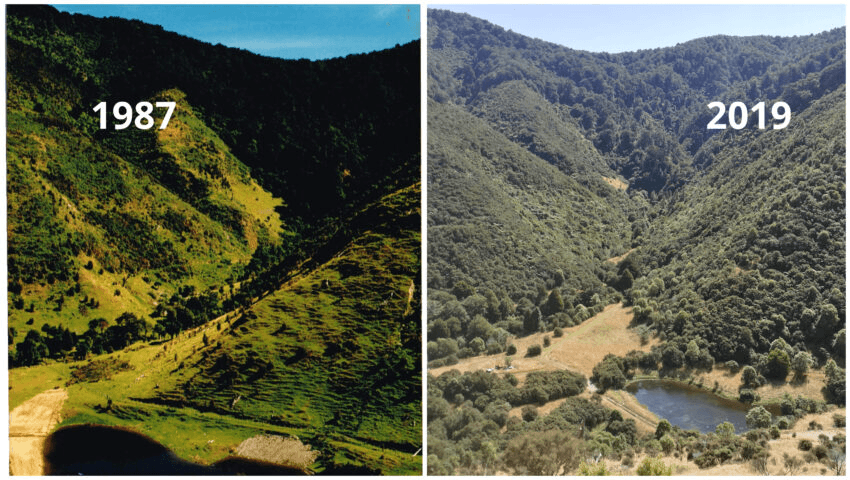 So far they have removed nearly a thousand predators. By increasing the biodiversity and protecting the birdlife, the hungry kererū spread the seed and the forest grows. Previously pastoral land is now dense with young kahikatea, totara, mānuka, kānuka hebe, and tarata, replenished by the good patch of unlogged forest on the property as a seed source.