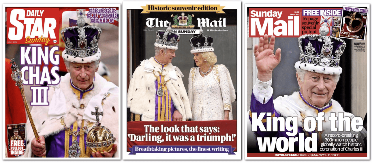 Read the Hosking on the boss king, and wash it down with an investigation into some very expensive shoes. Scroll through countless newspaper front pages here. Splash headlines include “The look that says ‘Darling, it was a triumph’”, “King of the World” (really), and “King Chas III”.