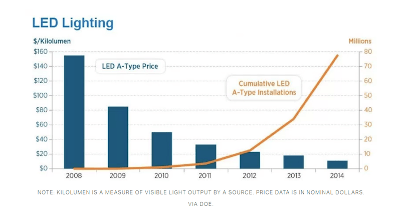 Well, as each improvement to LED technology is made, the price performance (the amount of light you get for your dollar) keeps improving. By one estimate, in the US, home LEDs provided 15 times as much light per dollar between 2008 and 2014. US consumers responded by installing nearly 80 million in their homes. By contrast, at the same time just 2% of homes were estimated to have LEDs.