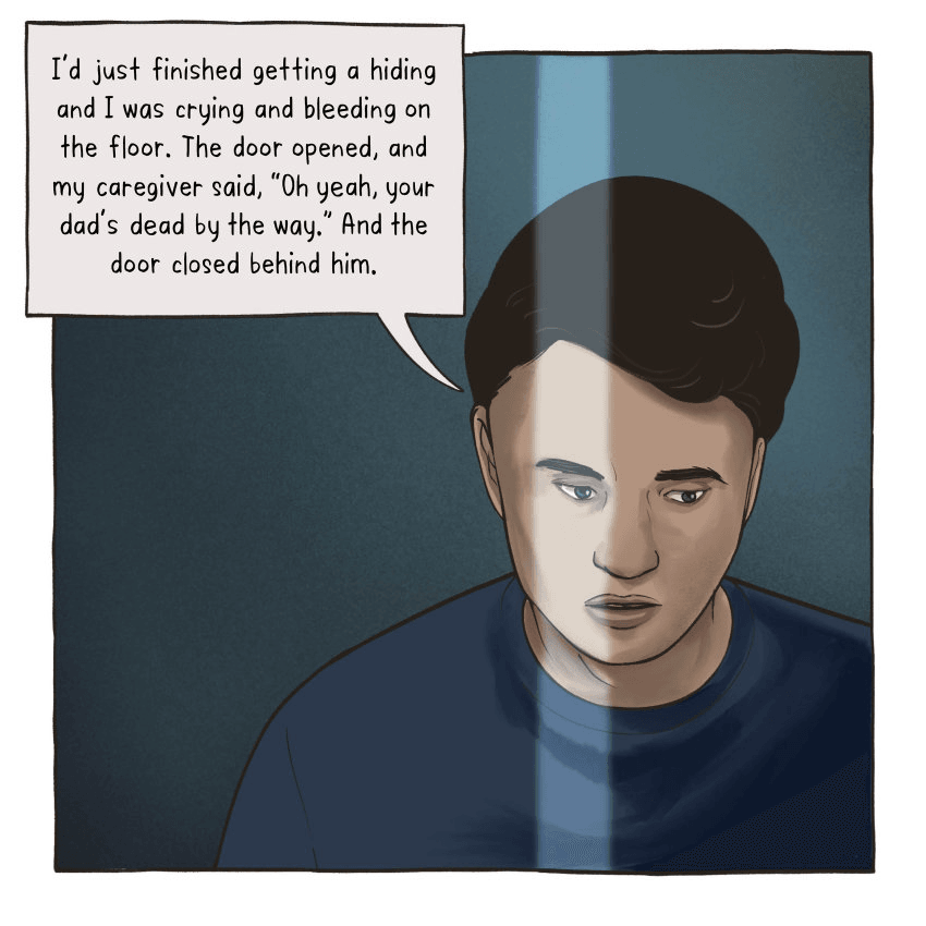 There’s another really important incident that happened when I was living with this man. One day I’d just finished getting a hiding and I was crying on the floor. I was bleeding. The door opened, and he said, “Oh yeah, your dad’s dead by the way.” And the door closed behind him. And I’ll never forget that feeling. Even though my father hadn’t had an active role in my life to that point, I looked to him for protection, I looked to him as my source of justice, a person who would beat up these guys who were beating me up. And that was gone.