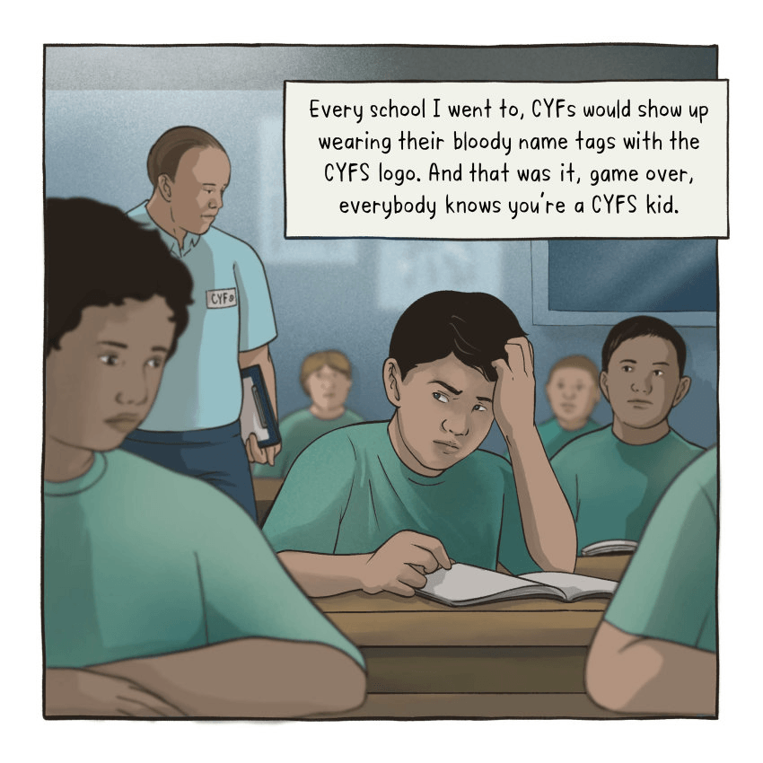 Something I feared the most when I started a new school was people finding out I was a CYFS kid, because I already struggled to make friends. And the only time you ever saw CYFS on the news it involved terrible things and I didn’t want people judging me on that. But every school that I went to, CYFs would show up wearing their bloody name tags with the CYFS logo, and that was it, game over, everybody knows you’re a CYFS kid.