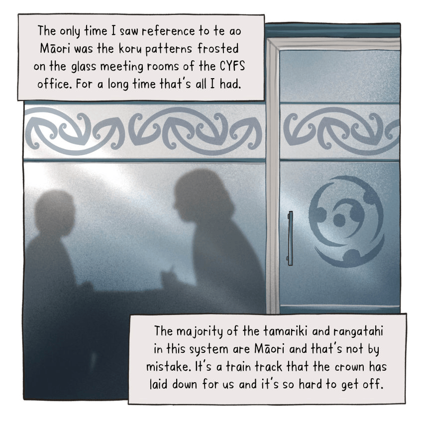The only time I saw reference to te ao Māori outside of that education centre was the koru patterns frosted on the glass meeting rooms of the CYFS office, which wasn’t a nice place to be. That was my small instruction to things Māori. For a long time that’s all I had.