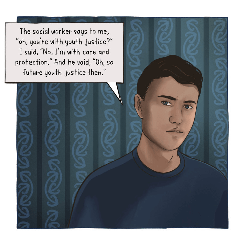 I can’t recall ever having a Māori social worker. To time travel a bit, at 15 years old I’d been self-harming quite a bit and had several attempts to end my own life. I was at the CYFS office in Takapuna because I didn’t know what to do. While I’m waiting there the social worker says to me, “Oh, you’re with youth justice?” I said, “No, I’m with care and protection.” And he said, “Oh, so future youth justice then.” And this was a care and protection social worker.