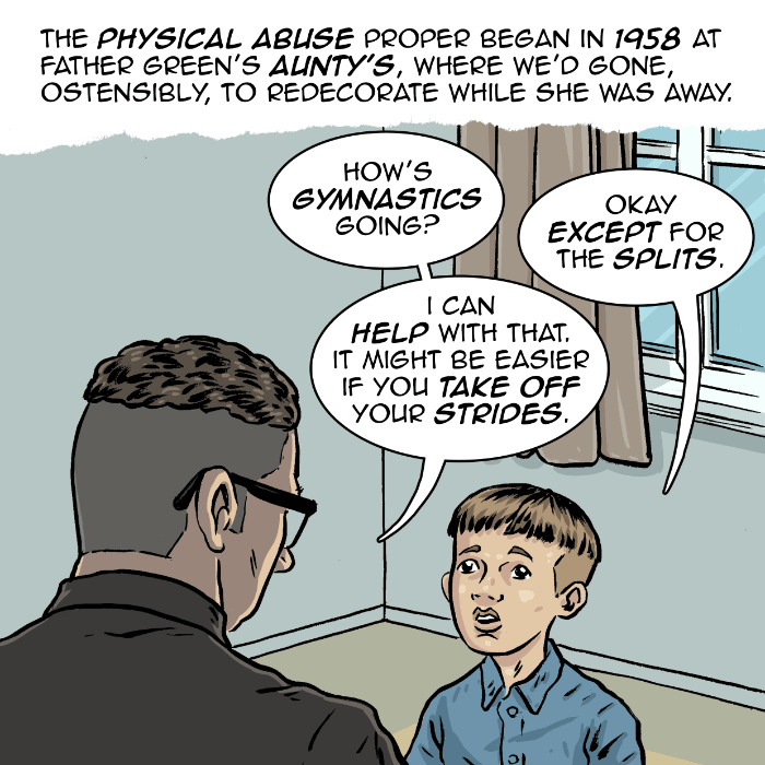 For me, the actual physical abuse proper began in 1958 at Father Green’s aunty’s place. Previously when doing gymnastics or especially when riding in the front seat of his car, he would rub up and down your legs and body quite inappropriately, although we certainly didn’t understand this at the time.