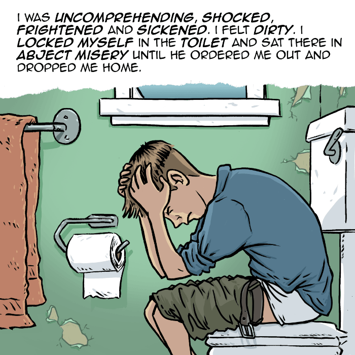 At the time I was totally uncomprehending of what had happened, shocked, frightened and sickened. I felt very dirty somehow. When he was finished, I went to the toilet and locked myself in and just sat there in abject misery until he ordered me out, dropped me home, then left with not a word spoken. My life had inexplicably turned into a total nightmare. More especially after all the teaching about piety and purity and burning in hell-fire forever if you sinned being hammered into us from an early age.