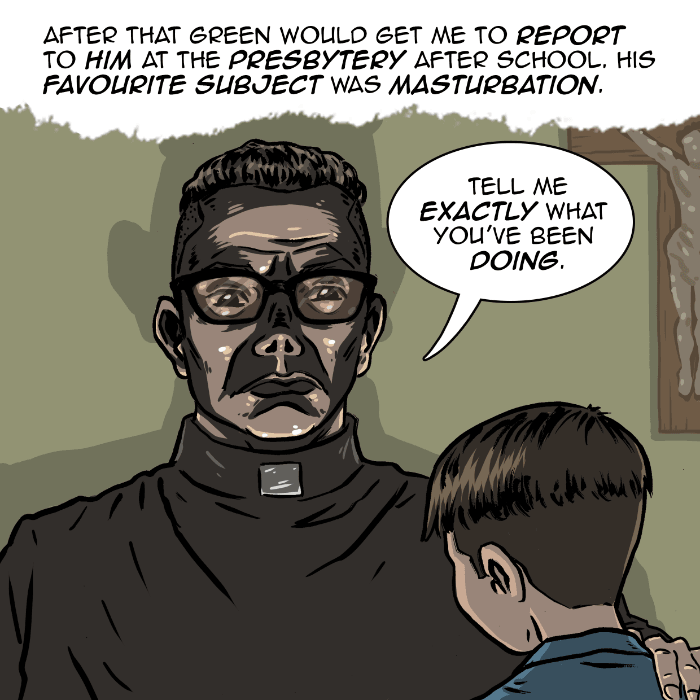 Green very quickly followed up the abuse with orders to the nuns for me to report to him at the presbytery after school for unspecified reasons. After just about sweating blood over this all day, sick and frightened about what may occur, I knew I could not ignore the instruction to go. Once there, he would accuse me of some sort of misdemeanour, all bullshit of course: theft, damage to the school or church or graveyard. But his favourite subject was masturbation. He seemed to have a fixation on this heinous sin but I didn’t even know what he was talking about. I remember him asking what colour the fluid was that came out of my penis when I played with myself. For me, aged eight, this was absolutely incomprehensible.