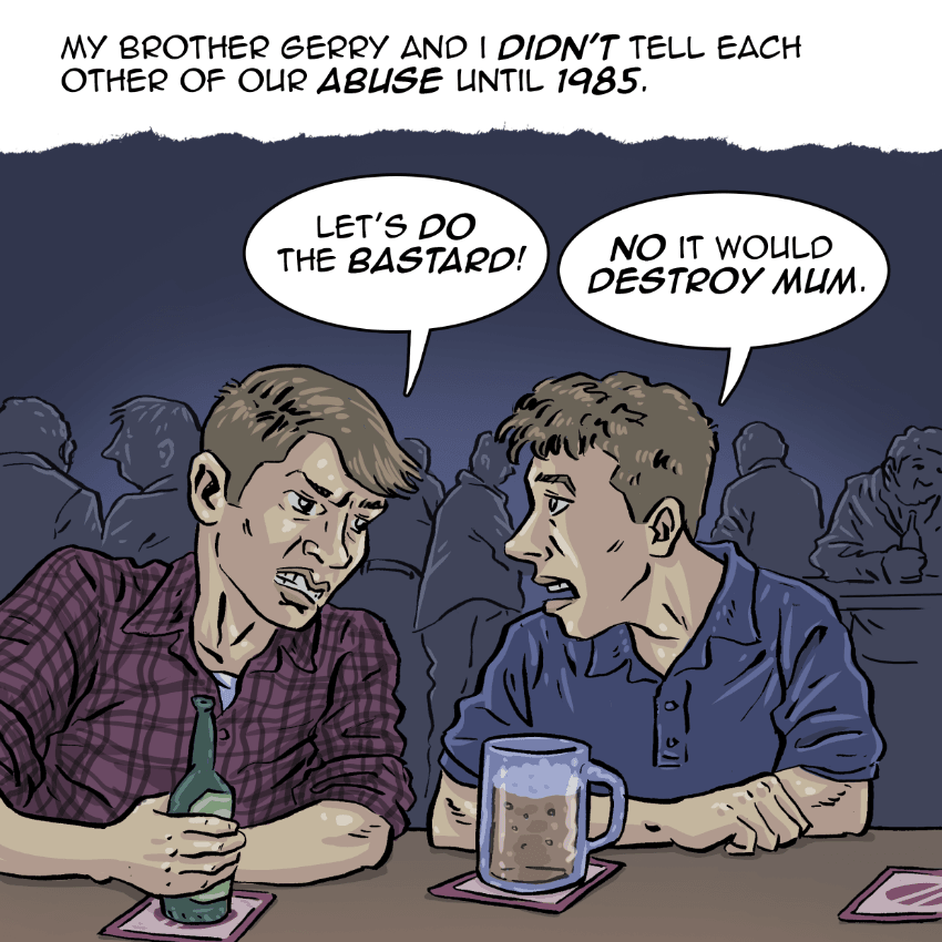 I never once managed to tell a soul of the abuse until my brother Gerry and I finally spoke about it in 1985. Green was still alive and I suggested, “Let’s do the bastard”, but Gerry cautioned that it would destroy our mum so we let it go. It was not until 2002 that my brother Chris, encouraged by his counsellor, shared his abuse with us.