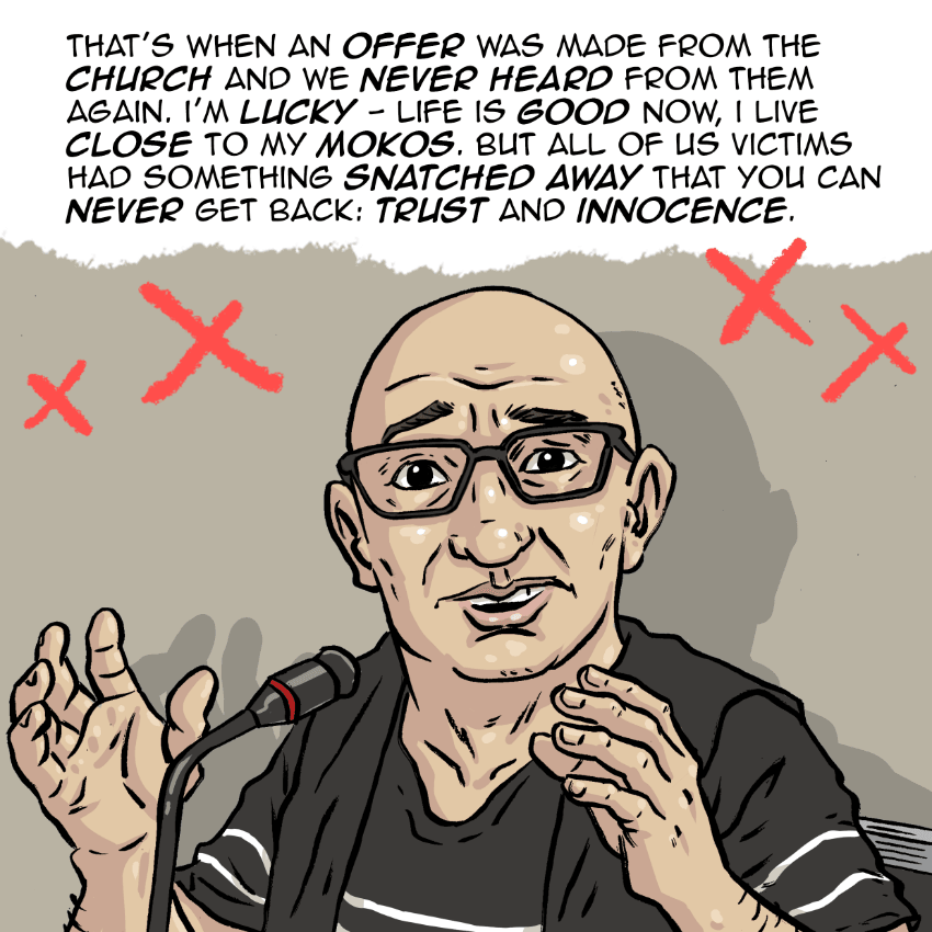 I brought my children up as heathens with a great contempt for any religion. You don’t need a bible in your hands to be a good person. They also knew that if they struck any problems, especially people problems, Dad would be there for them. I am lucky. My children are good people with many friends from all cultures and walks of life. I now live next door to one daughter who has two boys, and five minutes from another who has one girl, my mokos. Life is good. But I can’t help feeling it should have been much better for all of us victims. We all had something snatched away from us that you can never get back: trust and innocence.
