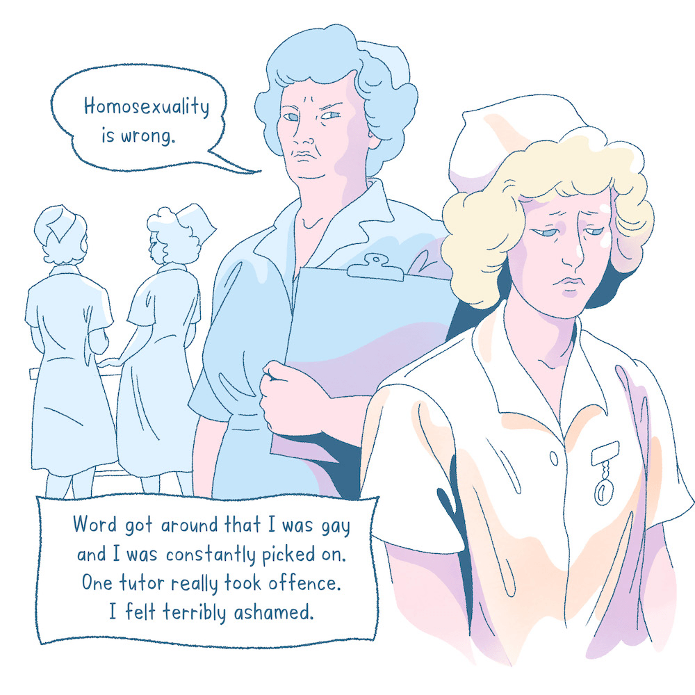 At Burwood, word got around that I was gay and I was constantly picked on. One tutor, in particular, really took offence. She’d make snide remarks or stare straight at me and say that homosexuality was wrong. She wrote comments on grade papers saying, “If you thought you were going to be a nurse you’re wrong.” I remember feeling terribly ashamed.