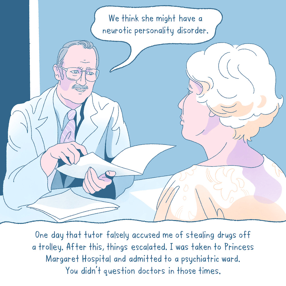 All I remember is being terrified and telling them this was a mistake, but they wouldn’t listen. They gave me drugs to quieten me down. My mother was being deeply anxious that I was in hospital – she wanted to know why I needed to be there. They thought I might have a neurotic personality disorder. You didn’t question the doctor’s authority during those times. They were like gods.