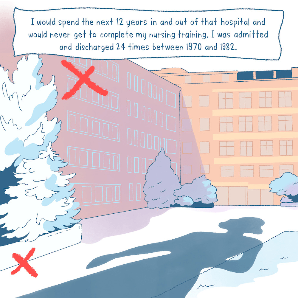 I was 18 and I didn’t realise it at the time, but I would spend the next 12 years in and out of that hospital and would never get to complete my nursing training. I was admitted and discharged 24 times between 1970 and 1982.