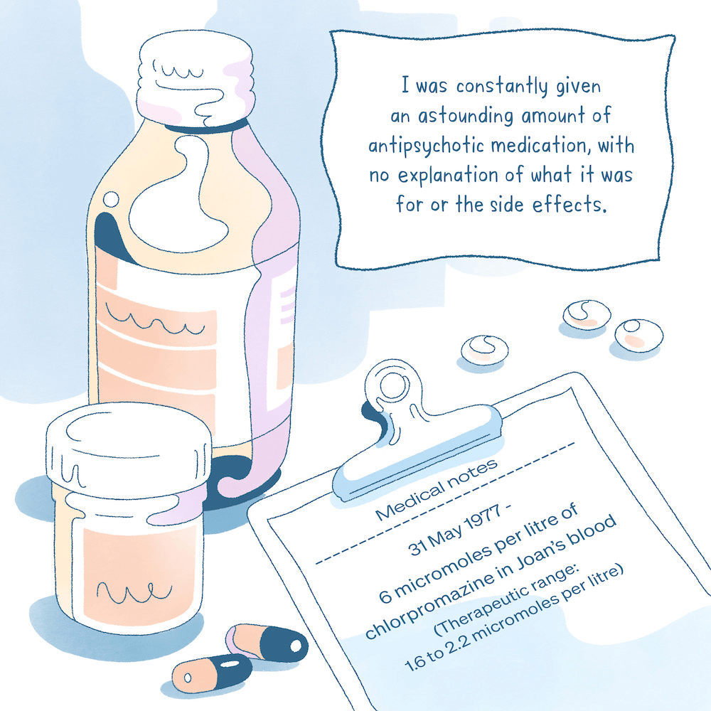 The hospital became part of me and when they told me to go home sometimes I didn’t want to go. I had become totally institutionalised. I believe this was due to the astounding amount of antipsychotic medication I was constantly given. They never explained what it was or what it was for. They also never talked about the side effects. The dosage was excessive. My medical notes say that on May 31, 1977 I had six micromoles per litre of chlorpromazine in my blood when the therapeutic range was 1.6 to 2.2 micromoles per litre.