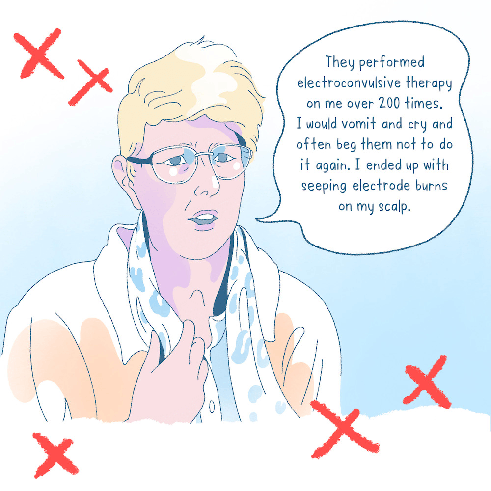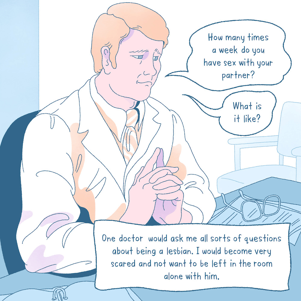 I can recall the doctor who I would see once or twice a week. He would ask me all sorts of questions about being a lesbian.”How many times a week do you have sex with your partner?” and, “What is it like?” I would become very scared and not want to be left in the room alone with him.