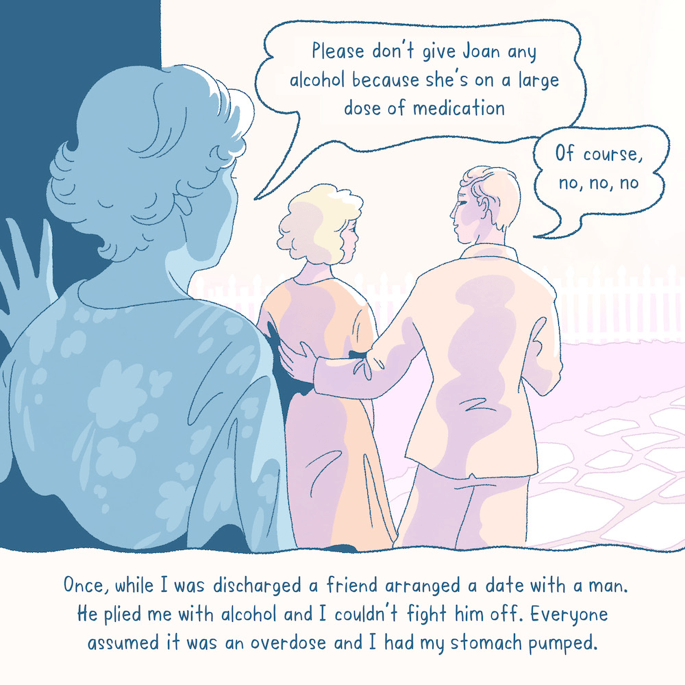 On one of the times I was allowed out for the day, I went on a date with a guy arranged by an old school friend, who thought if I just went out with a guy my sexuality might change. This guy came to my parents’ place and Mum said, “Please don’t give Joan any alcohol if you’re taking her out for lunch because she’s on quite a large dose of medication”, and he said “Of course, no, no, no”.