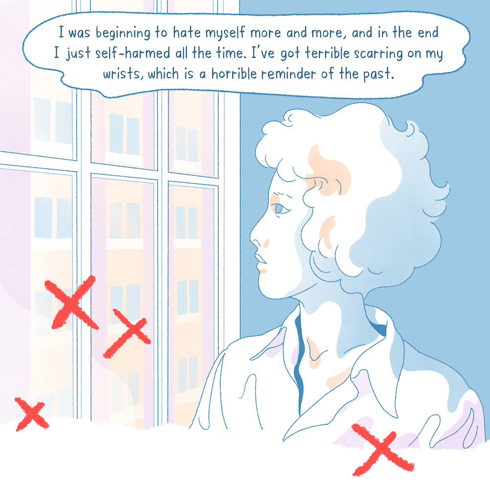 I was beginning to hate myself more and more, and in the end I just self-harmed all the time. So, consequently, I’ve got scarring, terrible scarring on my wrists, which is a horrible reminder of the past.