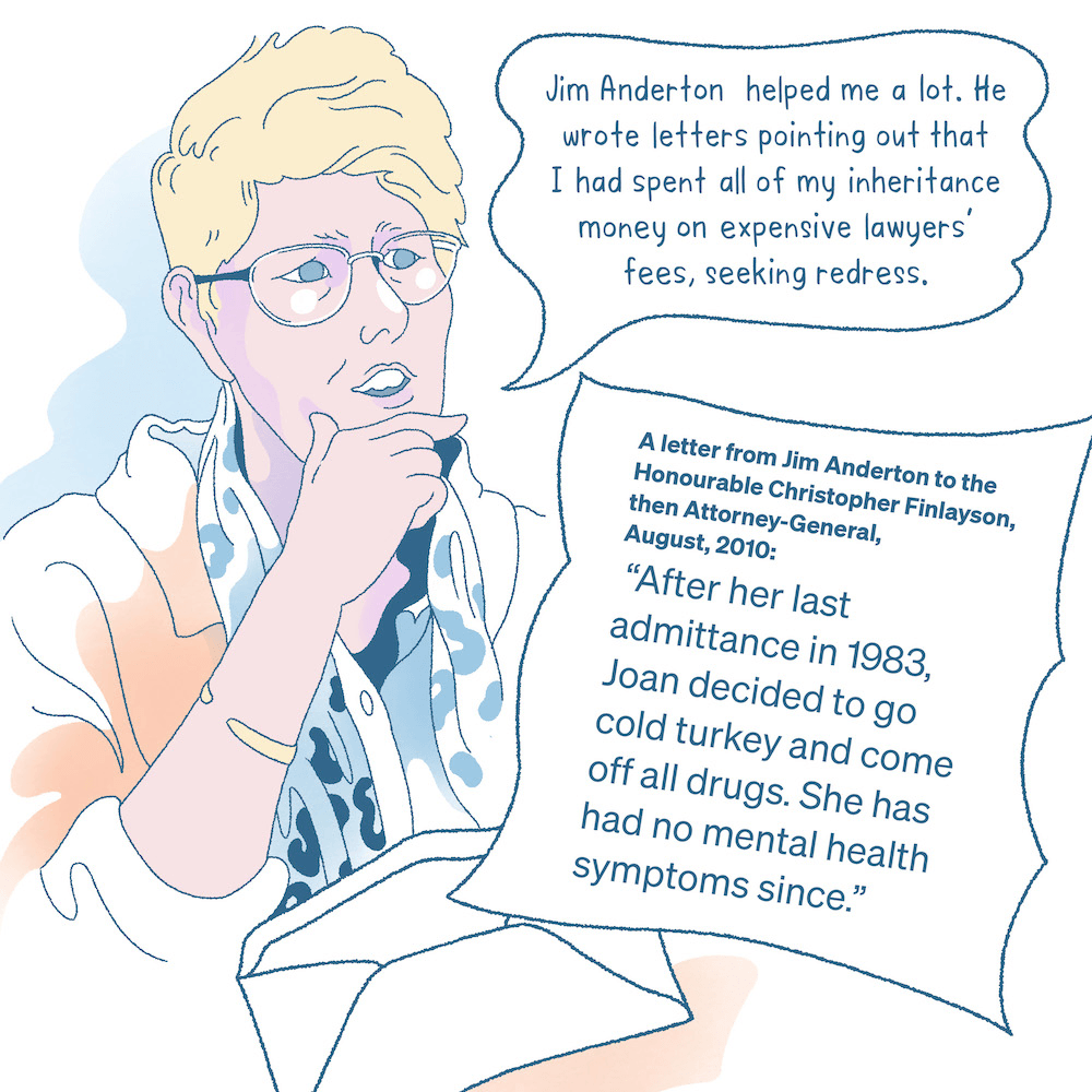 A letter from Jim Anderton to the Honourable Christopher Finlayson, then attorney-general, in August 2010: “After her last admittance in 1983, Joan decided to go cold turkey and come off all drugs. She has had no mental health symptoms since and the late Dr Les Ding, formally of Sunnyside Hospital, stated that the diagnosis of schizophrenia was wrong.”