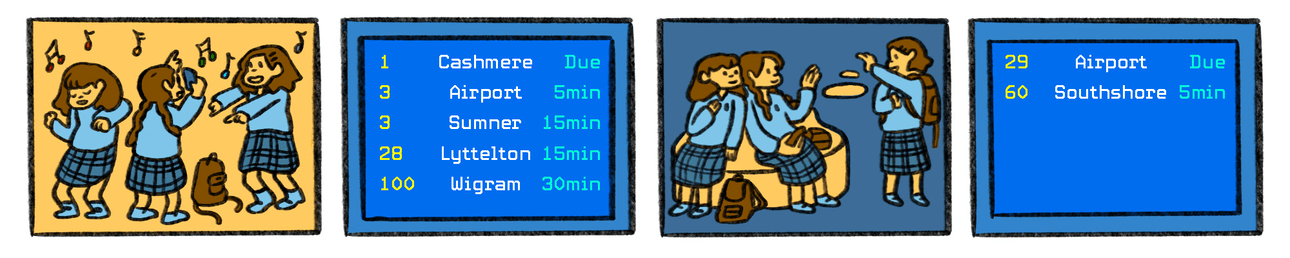 Design-wise, there was nothing special about it. The bus exchange wasn’t really a standalone affair, more of a sandwiched form between and inside some other nondescript buildings. It was two-storied, with a food court on the top, a main waiting area on the ground floor, and a smaller waiting room by the Colombo Street bus stops. This on-street waiting space was the most creatively ambitious aspect of the exchange. It had become quite dark and dingy, but it was obvious that it was once someone’s hopeful attempt at modernity. Their vision: curved walls of softly lit semi-opaque white panels, and rainbow-coloured plastic blobs for furniture. With a good scrub and more light, the room could have been the backdrop to any 2000s music video.