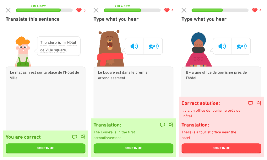 If you’re using the phone app you’ll get five hearts a day: each error loses you one heart. Once you’ve run out you’ll need to “buy” more hearts using points earned by completing previous lessons, or wait for your hearts to refill the next day. This is one of many places you’ll be prompted to upgrade to Duolingo Plus, the paid version of the app, which offers unlimited hearts. A lot of users despise the hearts system, a relatively recent innovation, but I find it encourages me to really focus on the lesson and not make stupid mistakes. And you can always avoid the hearts entirely by using Duolingo on the web.