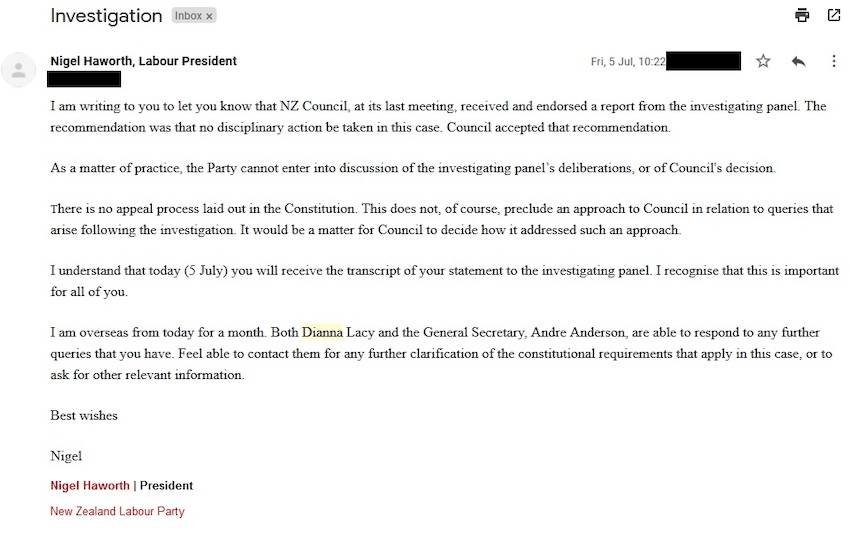 Sarah said she raised the allegations during an internal inquiry, with the investigating panel comprising three members of the New Zealand Council, the Labour Party’s governing body. Sarah and the other complainants were invited to appear before the panel at a meeting held at the Labour Party’s offices in Wellington. At the conclusion of the inquiry, after months with scant communication, the seven complainants all received an email from party president Nigel Haworth detailing the outcome of the internal investigation. “The recommendation was that no disciplinary action be taken in this case,” he wrote. “The New Zealand Council has accepted this recommendation.”