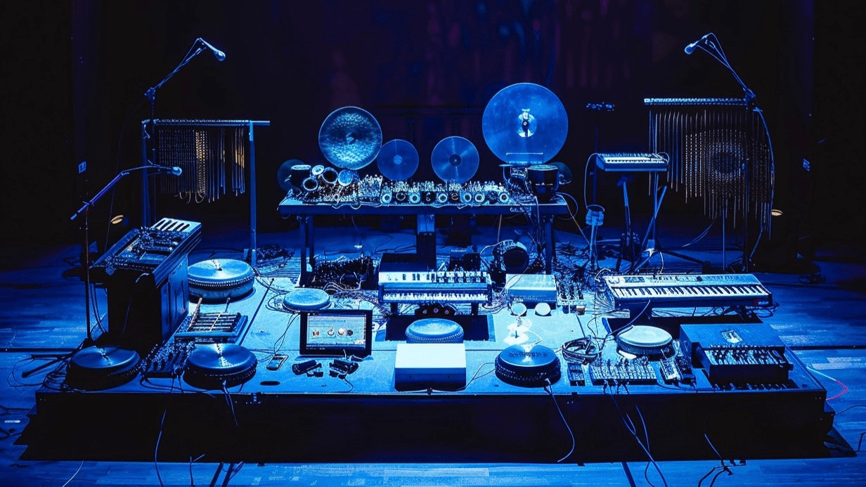Then there was the stage itself, at the front of the hall. A big feature was the myriad of gongs played by Erika Grant from Orchestra of Spheres. They came in all sizes, hung from a range of frames, some organised from smallest to largest, the bigger ones taking centre stage on their own. Other musicians were arranging and rearranging smaller instruments, most of which I didn’t recognise. A man with incredible dreadlocks was tinkering on a laptop.