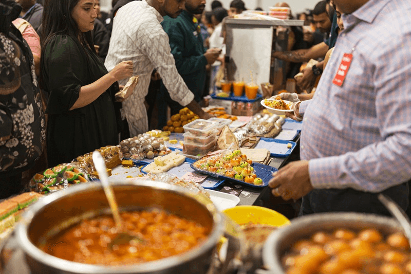 We pushed through the growing crowd into the food hall. Stall after stall sold version after version of street food favourites: pani puri (small crunchy shells with various fillings), vadai (fried, spicy, savoury onion doughnut), idli (soft, fermented, steamed bread), and pav bhaji (toasted white buns spread with butter, and a potato-based curry). A young boy in a grey hoodie walked through the crowd with a tray of jalebi, my favourite ever treat (shoutout to Tesher x Jason Derulo). There was even ice golla, a shaved ice and syrup treat that my friend Sharvari had three of the weekend before at Auckland Diwali.